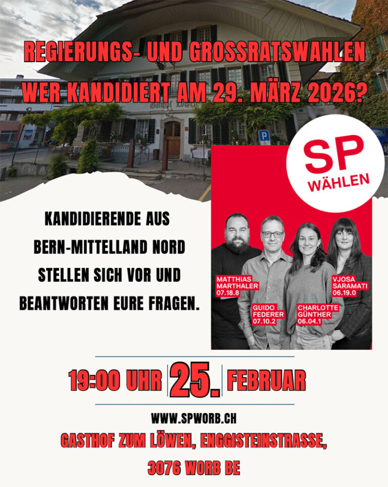 Die SP Worb lädt am 25. Februar um 19:00 Uhr in den Löwen Worb ein.
